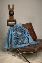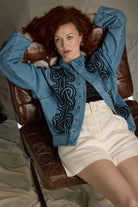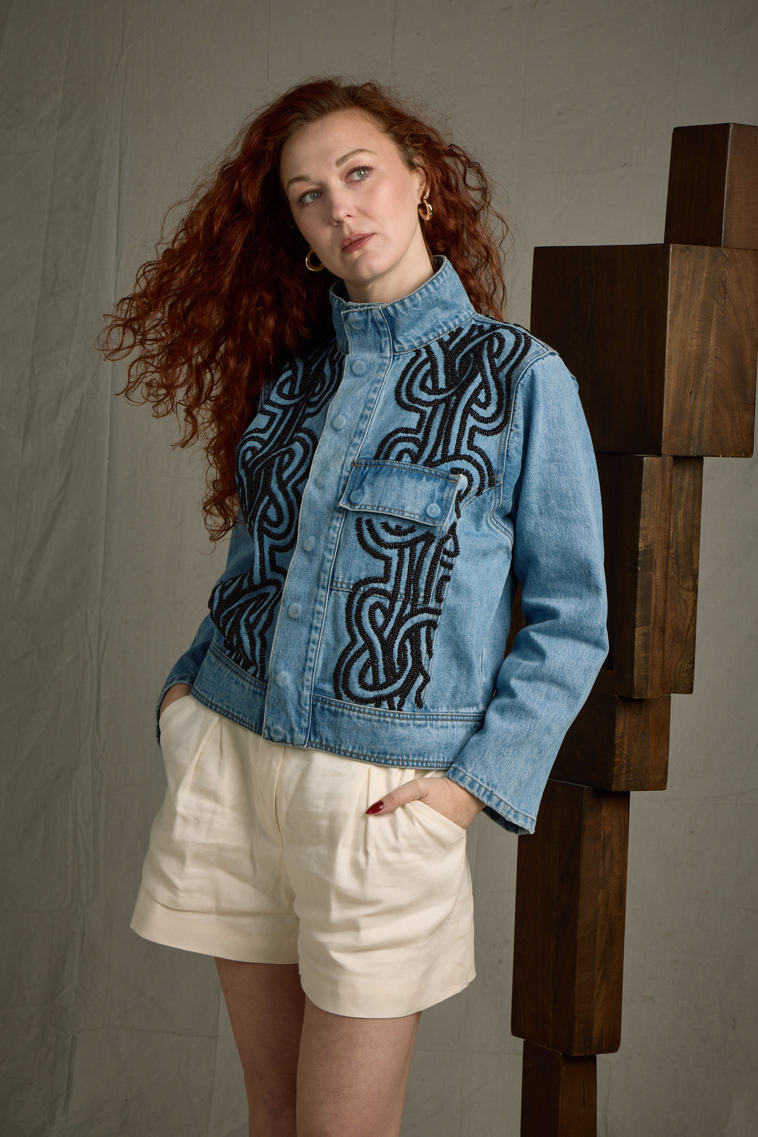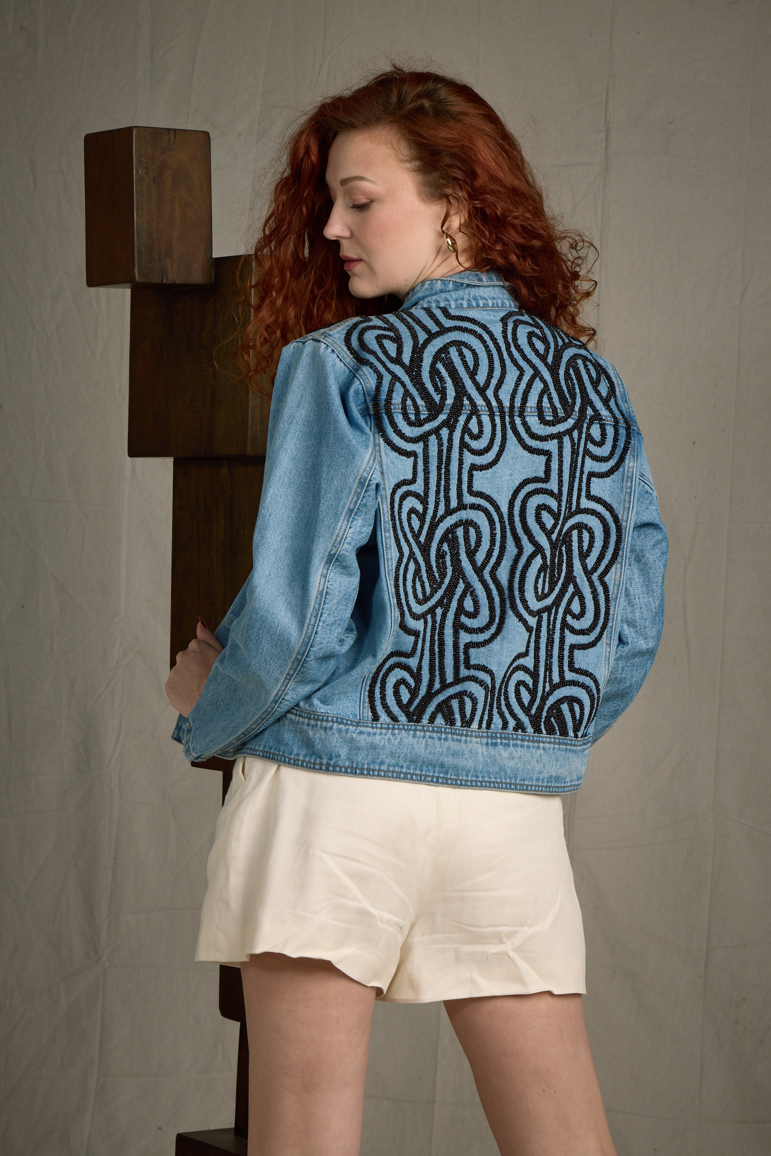 The Knotted Jacket is a timeless one- of - kind statement piece, meticulously hand-embellished for bold individuality. Crafted from 100% premium cotton denim, this moto-style jacket features a structured high neck, straight sleeves, and snap-front closure for a sleek, modern silhouette. The standout detail? A stunning black beaded knot design, intricately hand-applied on both the front and back—making this jacket as unique as the person who wears it. Equal parts edgy and elegant, it's the perfect fusion of craftsmanship and style.