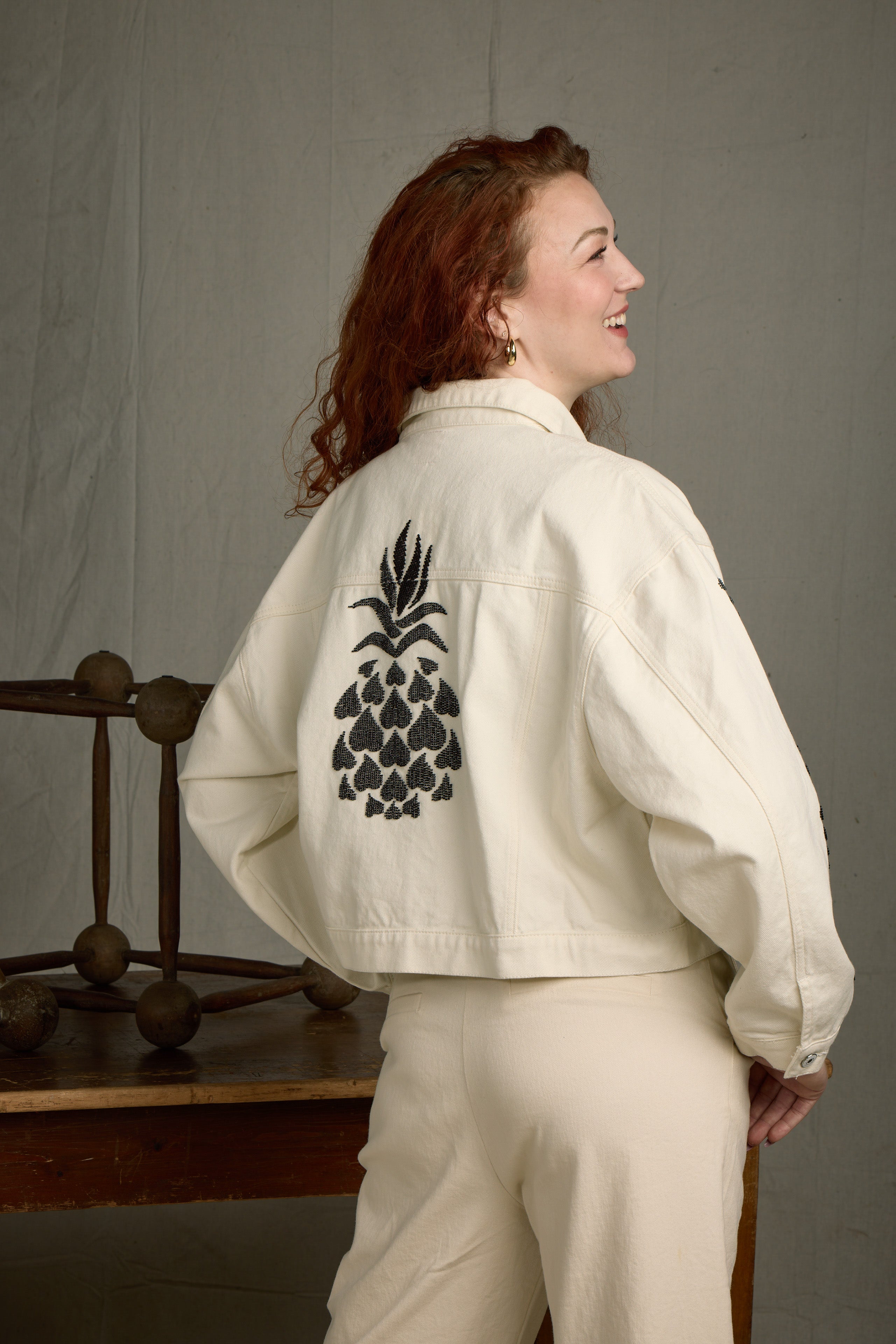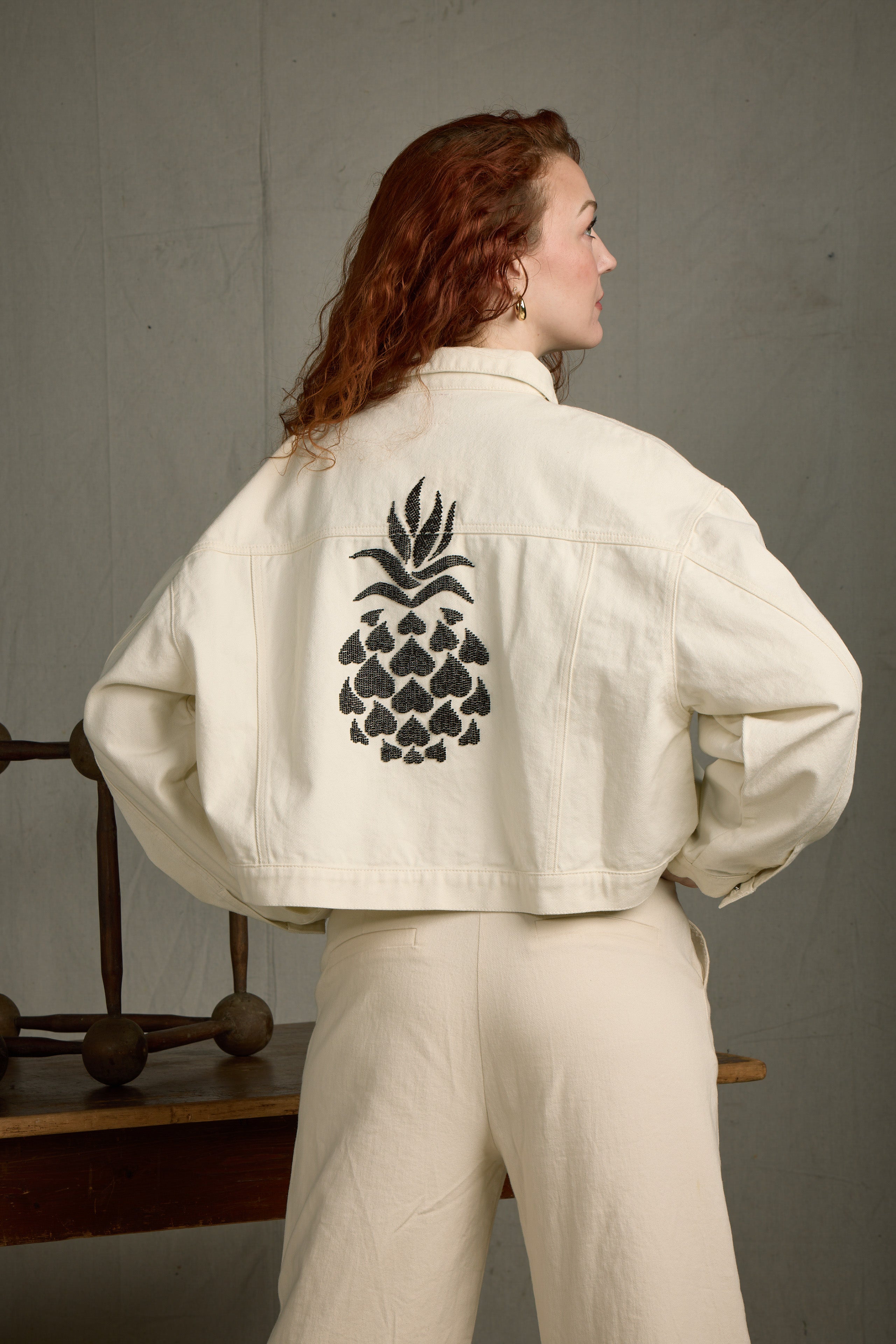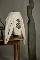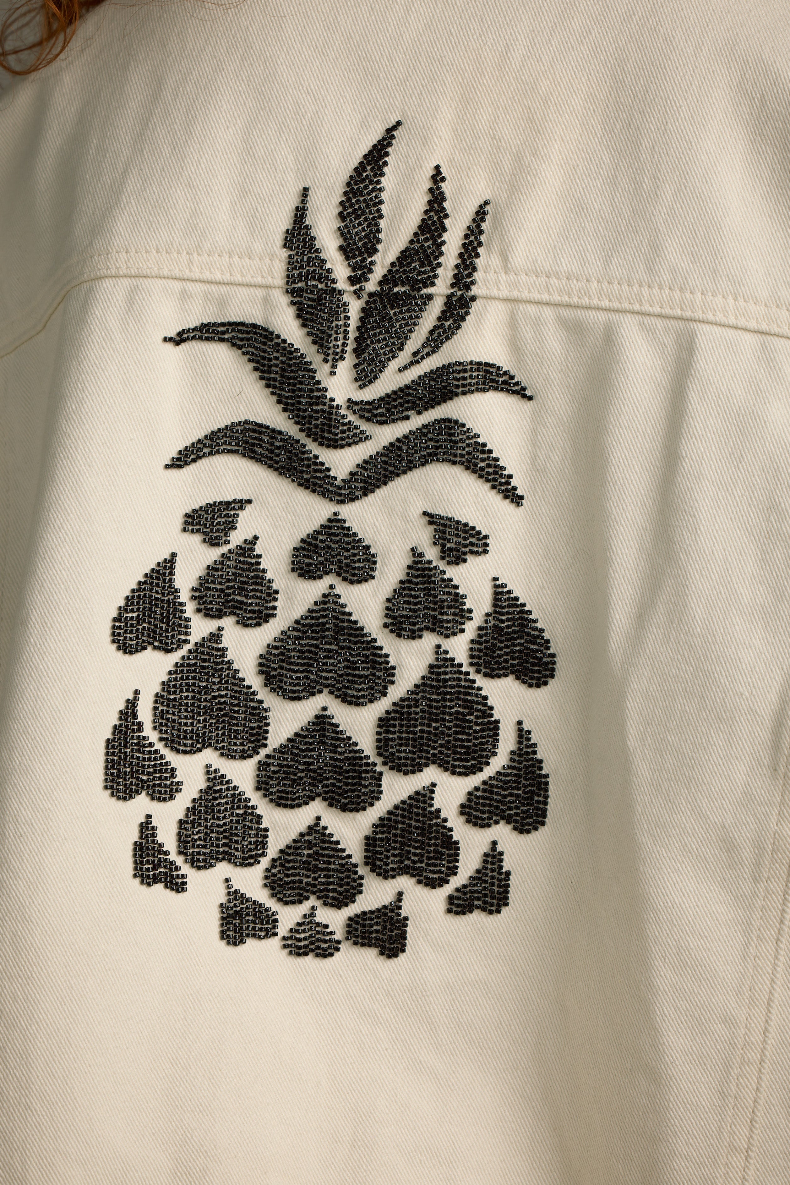 The Pineapple Jacket is where whimsy meets statement style. Crafted in a creamy 100% cotton denim and hand-embellished with sleek black beading, this oversized jacket brings effortless charm to your wardrobe. The back features a one-of-a-kind pineapple design composed entirely of black seed beads, while matching heart details accent the sleeves—because love is in the details. Designed with a clean hem and relaxed silhouette, it offers a modern, easy-to-style edge.