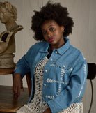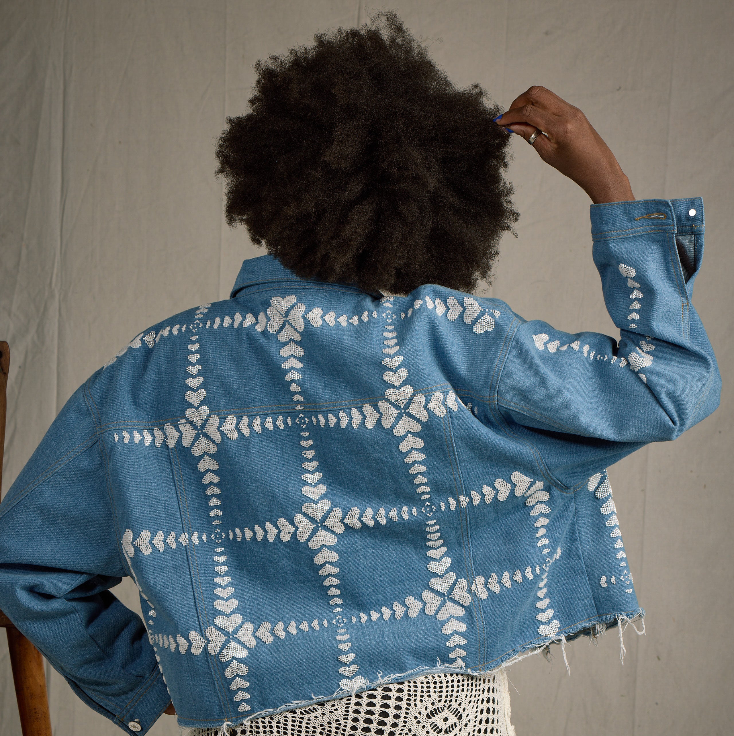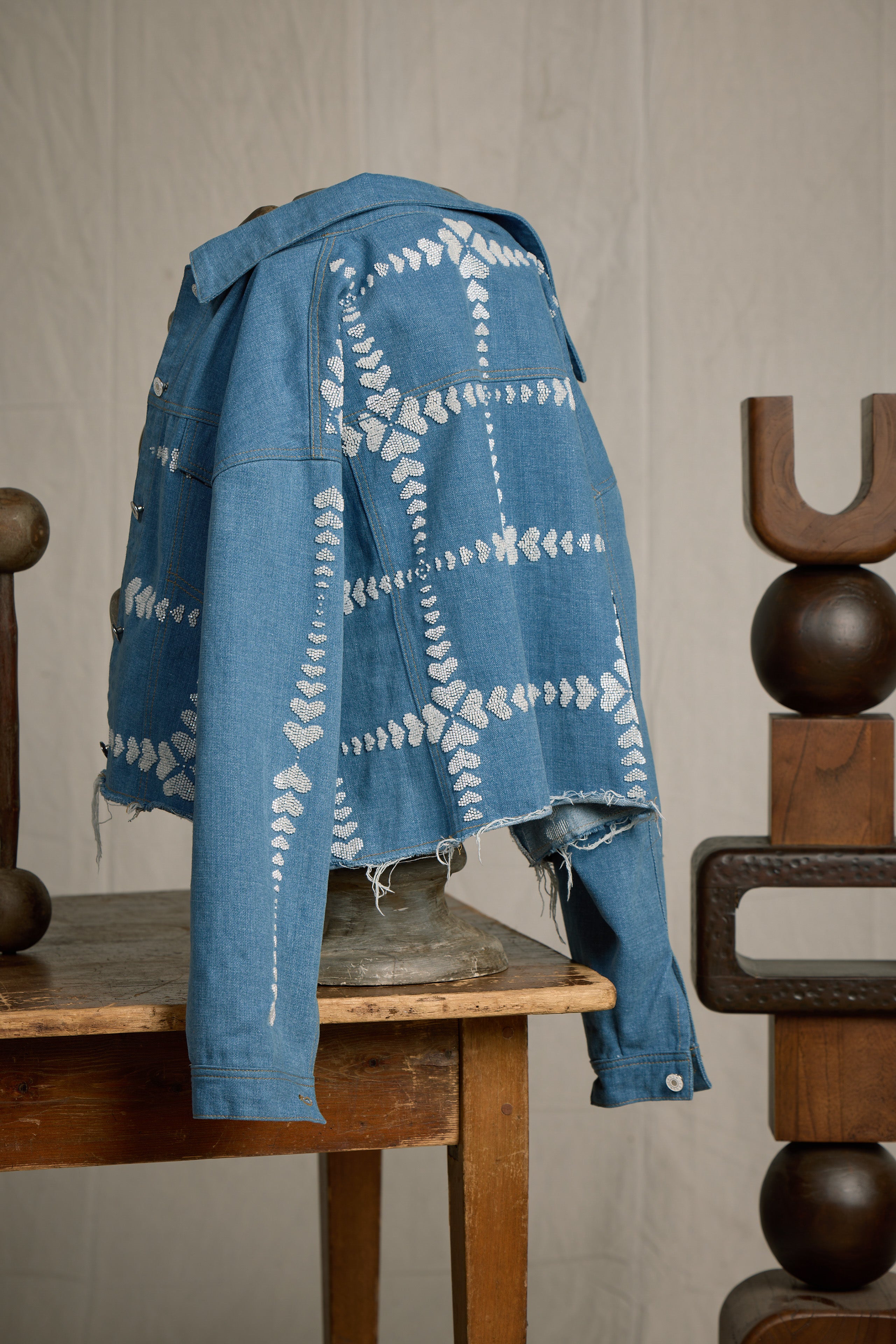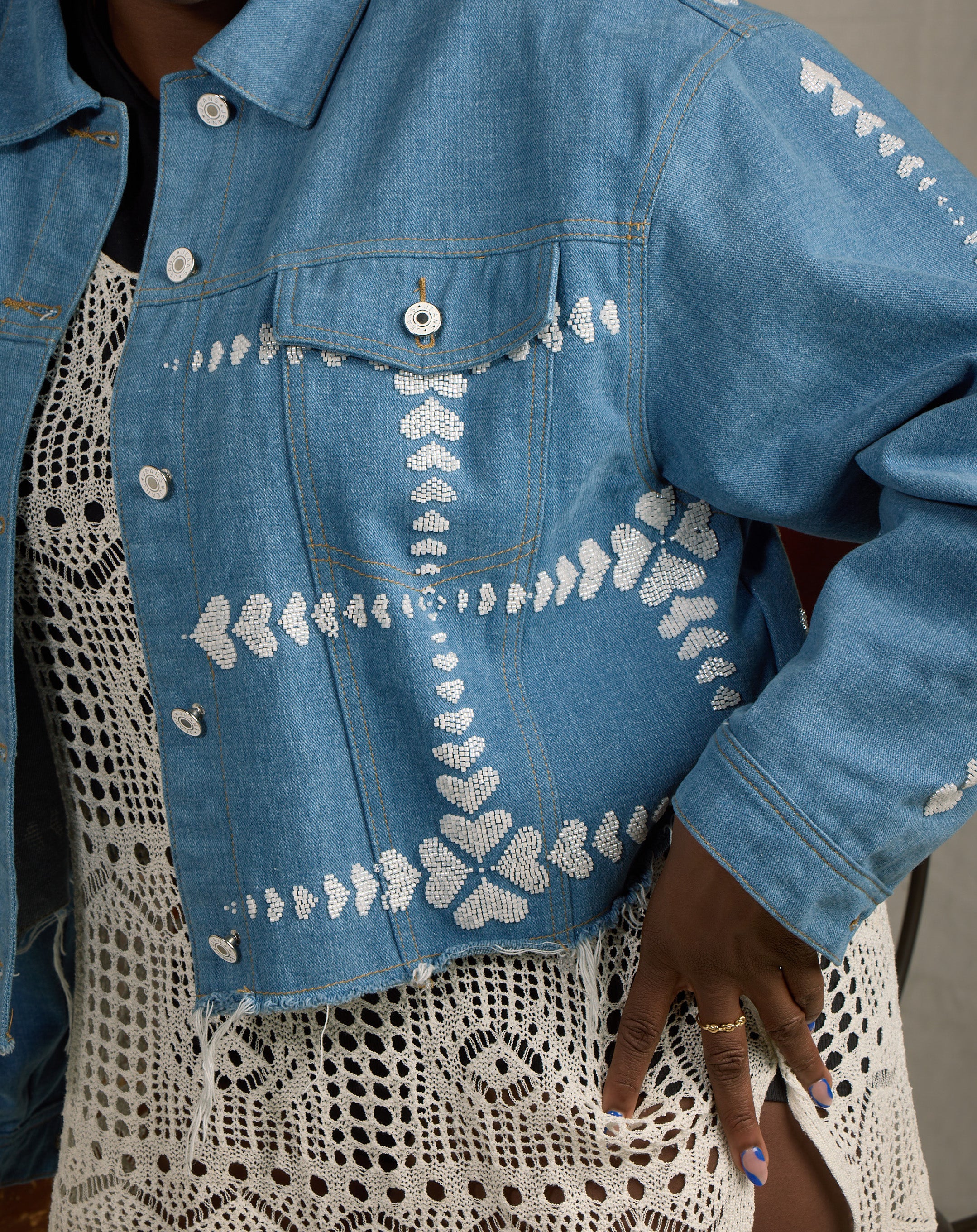 The Queen of Hearts jacket is a timeless statement piece, meticulously crafted from 100% cotton denim in a luxurious denim/Ivory color. With beaded heart design on front, back, and down the sleeve. This oversized, boxy jacket features dolman sleeves for a relaxed, flattering fit. The raw edge at the bottom adds a modern touch, elevating its edgy yet refined aesthetic. This jacket combines artistry and sophistication. Whether you're looking to elevate your casual wardrobe or make a bold, fashionable statement, the Queen of Hearts jacket will add a touch of elegance and charm to any outfit.
