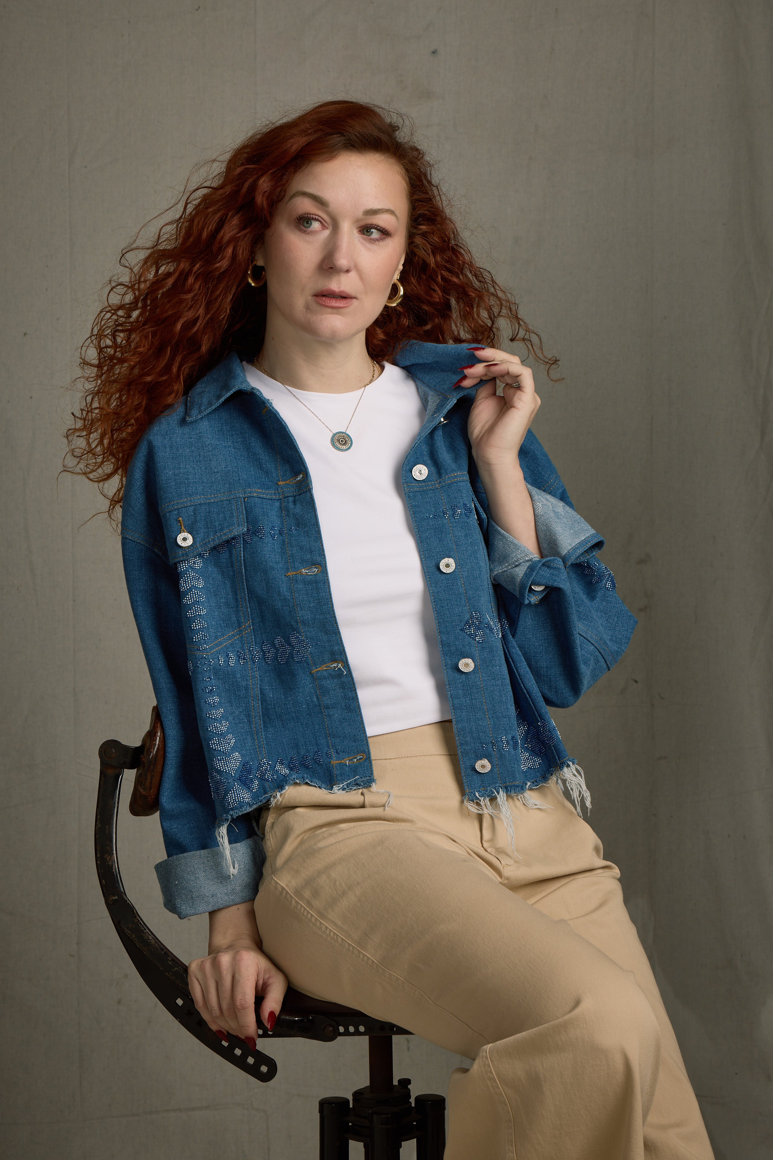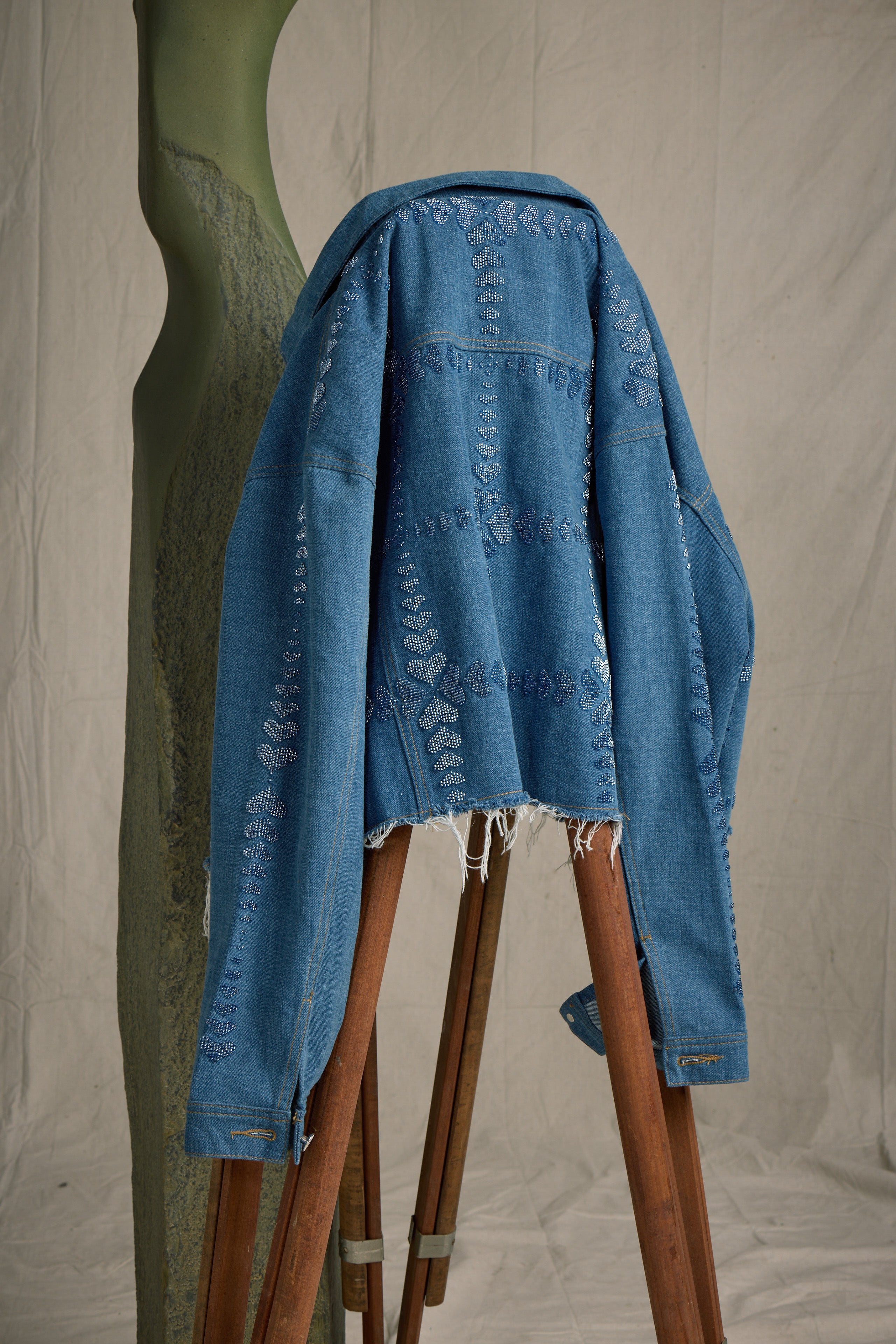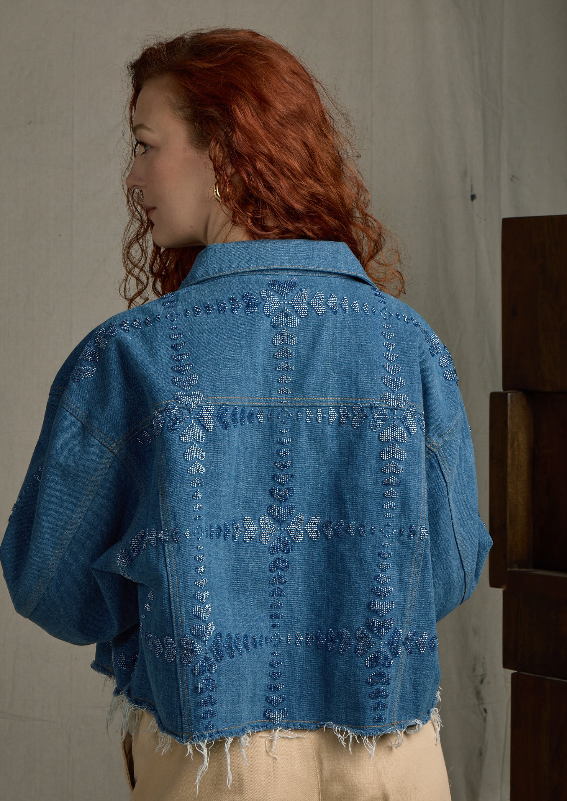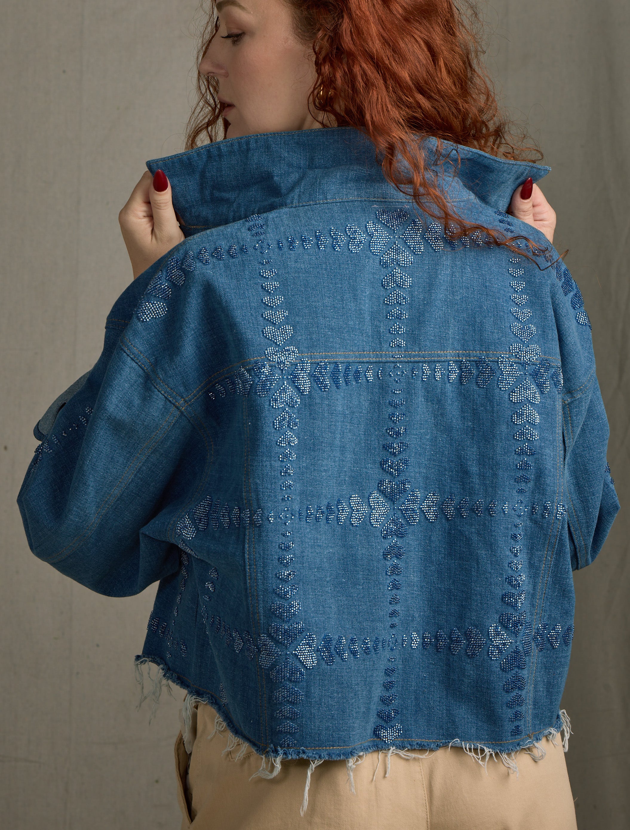 The Queen of Hearts jacket is a timeless statement piece, meticulously crafted from 100% cotton denim in a luxurious Denim/Denim color. With beaded heart design on front, back, and down the sleeve. This oversized, boxy jacket features dolman sleeves for a relaxed, flattering fit. The raw edge at the bottom adds a modern touch, elevating its edgy yet refined aesthetic. This jacket combines artistry and sophistication. Whether you're looking to elevate your casual wardrobe or make a bold, fashionable statement, the Queen of Hearts jacket will add a touch of elegance and charm to any outfit.